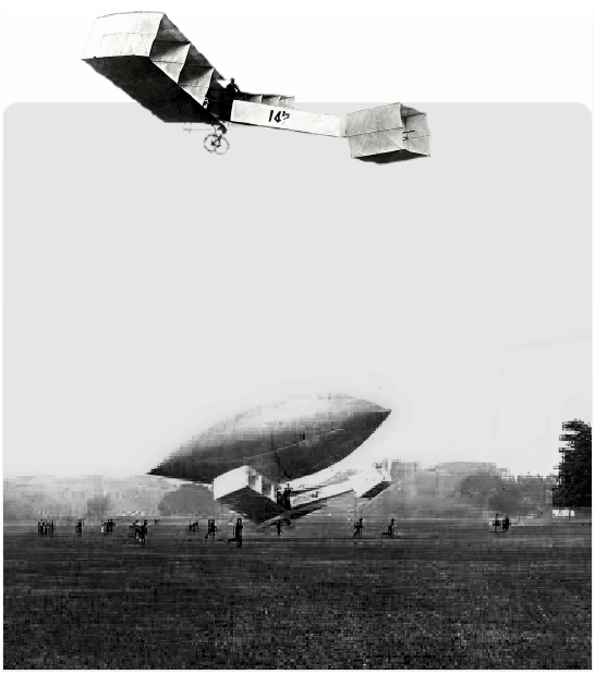 Em 1906, iniciou os primeiros ensaios com um novo aparelho, um biplano unido a um balão de hidrogênio, batizado de 14-bis. A intenção foi concorrer à Taça Archdeacon, destinada ao primeiro voo controlado de mais de 25 metros, sem qualquer auxílio externo. No mês de outubro, após algumas tentativas frustradas, Santos-Dumont atravessou 60 metros do campo de Bagatelle, em Paris. Em 12 de novembro repetiu o feito, dessa vez por 220 metros, e provou ser possível construir uma aeronave mais pesada que o ar capaz de decolar e voar.