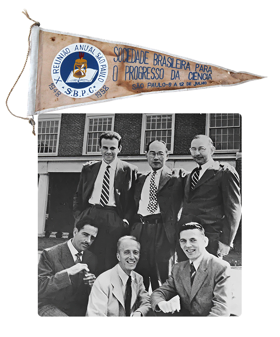 princeton (eua) em 1949, hideki yukawa. césar lattes, walter schutzer, hervásio de carvalho, josé leite lopes e jayme tiomno. lattes, tiomno, leite e hervásio. – acervo cbpf